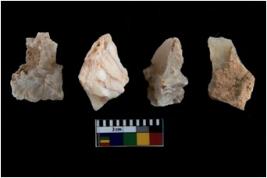 | Description / विवरण | Specimen of cores having several broad fluted marks indicating the detached blades from it. |