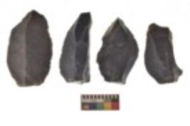 | Description / विवरण | There are n 4 utilized flake cores. There are multi directional irregular scar pattern on both dorsal and ventral face of the flake cores. Three are tapering at one end and one has sharp edge. |