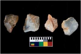 | Description / विवरण | There are n 4 utilized flake cores. There are multi directional irregular scar pattern on them. Three are tapering at one end and one has sharp edge. |