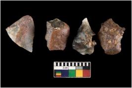 | Description / विवरण | There are n 4 utilized flake cores. There are multi directional irregular scar pattern on them. Three are tapering at one end and one has sharp edge. |