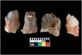 | Description / विवरण | There are n 4 utilized flake cores. There are multi directional irregular scar pattern on them. Three are tapering at one end and one has sharp edge. |