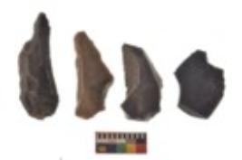 | Description / विवरण | There are n 4 utilized flake cores. There are multi directional irregular scar pattern on both dorsal and ventral face of the flake cores. Two are tapering at one end and two have sharp edges. |