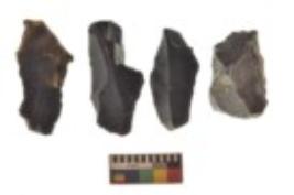 | Description / विवरण | There are n 4 utilized flake cores. There are multi directional irregular scar pattern on both dorsal and ventral face of the flake cores. Two are tapering at one end and two have sharp edges. |