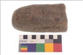 | Description / विवरण | Specimen of a roughly rounded cylindrical shaped pounder stone with battered surfaced and truncated end to hold the object |