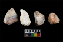 | Description / विवरण | There are n 4 of utilized worked cores. They show multidirectional irregular dominant scar pattern and have sharp edges. Two are tapering at oen end. |