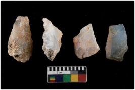 | Description / विवरण | There are n 4 utilized flake cores. There are multi directional irregular scar pattern on them. Two are tapering at one end and two have sharp edges. |