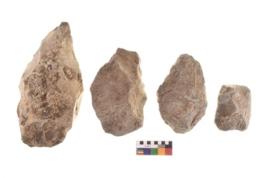 | Description / विवरण | There are n 4 of utilized worked cores and show irregular scar pattern. Two have a broken tip. |