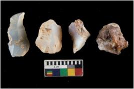| Description / विवरण | There are n 4 utilized flake cores. There are multi directional irregular scar pattern on them. One is tapering at one end and three have blunted edges. |
