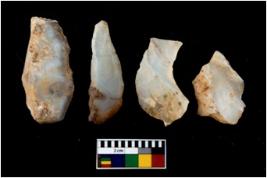 | Description / विवरण | There are n 4 utilized flake cores. There are multi directional irregular scar pattern on them. Three are tapering at one end and one has sharp edge. |