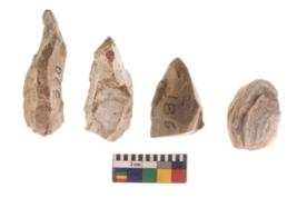 | Description / विवरण | There are n 4 of utilized worked cores and show irregular scar pattern on both dorsal and ventral side. Three are tapering at one end. |