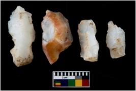 | Description / विवरण | There are n 4 utilized flake cores. There are multi directional irregular scar pattern on them. Three are tapering at one end and one has sharp edge. |