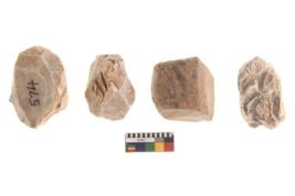 | Description / विवरण | There are n 4 of utilized worked cores and show irregular scar pattern on both dorsal and ventral side. One has a flat base as well as a broken tip. |