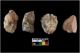 | Description / विवरण | There are n 4 utilized flake cores. Out of them one is made up of Chert and three are made up of Chalcedony. There are multi directional irregular scar pattern on them. Two are tapering at one end and two have blunted edges. |