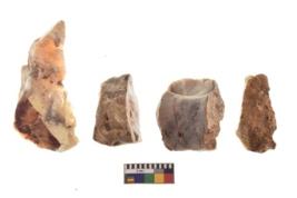 | Description / विवरण | There are n 4 of utilized worked cores and show irregular scar pattern. One is elongated in shape and is tapering at one end. |