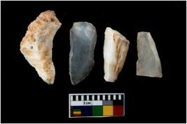 | Description / विवरण | There are n 4 utilized flake cores. There are multi directional irregular scar pattern on them. Three are tapering at one end and one has sharp edge. |