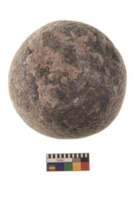 | Description / विवरण | Specimen of a hammer stone roughly rounded in shape with grounded edges and flattish base. |