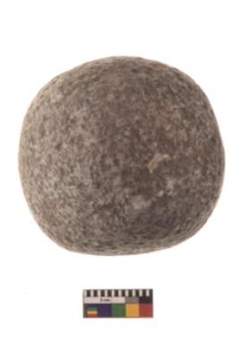 | Description / विवरण | Specimen of a spherical shaped hammer stone with battered surface |