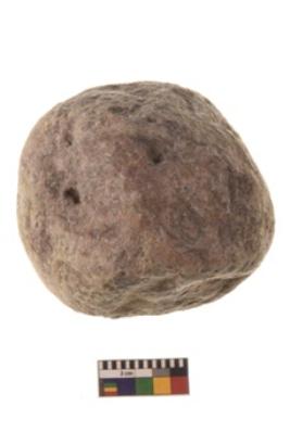 | Description / विवरण | Specimen of a roughly rounded shaped hammer stone with battered surface |