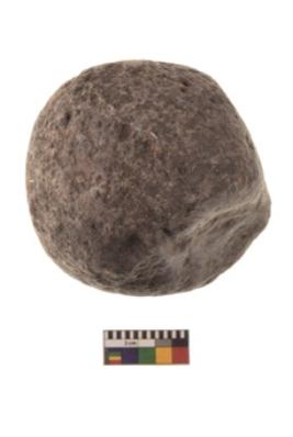 | Description / विवरण | Specimen of a hammer stone roughly rounded in shape with grounded edges and flattish base. |