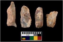 | Description / विवरण | There are n 4 utilized flake cores. There are multi directional irregular scar pattern on them. Two are tapering at one end and two have sharp edges. |