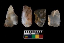 | Description / विवरण | There are n 4 ; worked utilized flakes; there are multidirectional irregular scar pattern on both dorsal and ventral face of the flakes. Two of them are tapering at one end. All are having sharp edges. |