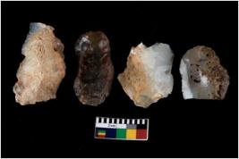 | Description / विवरण | There are n 4 ; worked utilized flakes; there are multidirectional irregular scar pattern on both dorsal and ventral face of the flakes. One of them is tapering at one end. All are having sharp edges. |