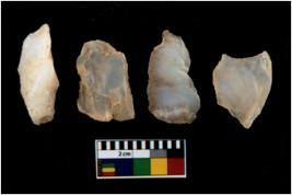 | Description / विवरण | There are n 4 utilized flake cores. There are multi directional irregular scar pattern on them. Two are tapering at one end and two have sharp edges. |