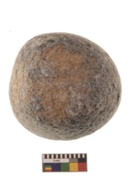 | Description / विवरण | Specimen of a hammer stone roughly rounded in shape with grounded edges and flattish base. |