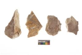 | Description / विवरण | There are n 4 of utilized worked cores and show irregular scar pattern on both dorsal and ventral side. They have sharp edges and three are tapering at one end. |