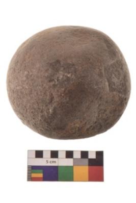 | Description / विवरण | Specimen of a hammer stone roughly rounded in shape with grounded edges and flattish base. |