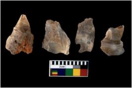 | Description / विवरण | There are n 4 utilized flake cores. There are multi directional irregular scar pattern on them. Three are tapering at one end and one has sharp edge. |