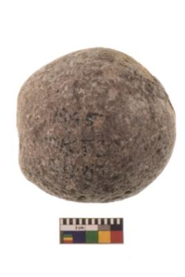 | Description / विवरण | Specimen of a spherical shaped hammer stone with battered surface |