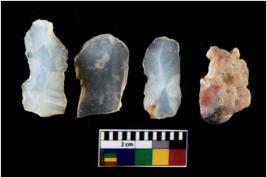 | Description / विवरण | There are n 4 utilized flake cores. There are multi directional irregular scar pattern on them. All of them are tapering at one end. |