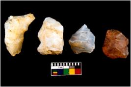 | Description / विवरण | There are n 4 objects; among them one is flake core which has tip on the top, one has flat base along with groove marks. |