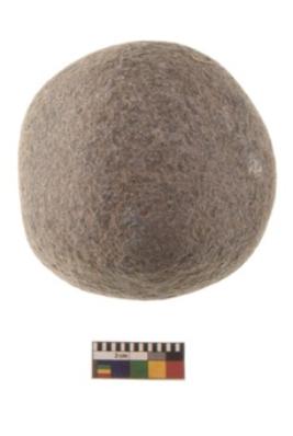 | Description / विवरण | Specimen of a hammer stone roughly rounded in shape with grounded edges and flattish base. |