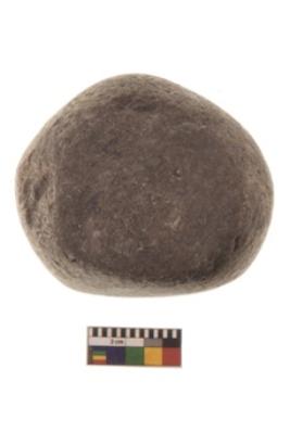 | Description / विवरण | Specimen of a hammer stone roughly rounded in shape with grounded edges and flattish base. |