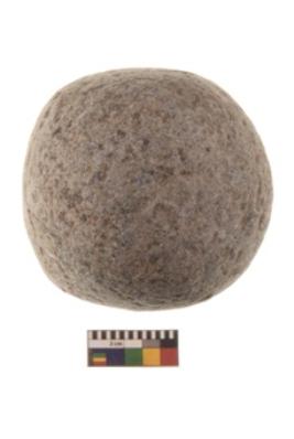 | Description / विवरण | Specimen of a spherical shaped hammer stone with battered surface |
