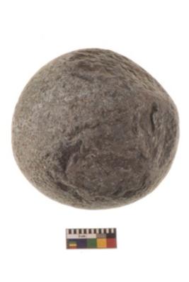 | Description / विवरण | Specimen of a spherical shaped hammer stone with battered surface |