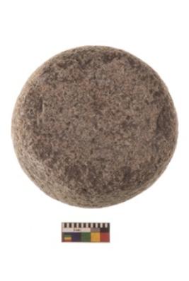 | Description / विवरण | Specimen of a hammer stone roughly rounded in shape with grounded edges and flattish base. |