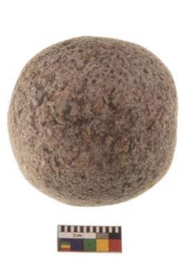 | Description / विवरण | Specimen of a spherical shaped hammer stone with battered surface |
