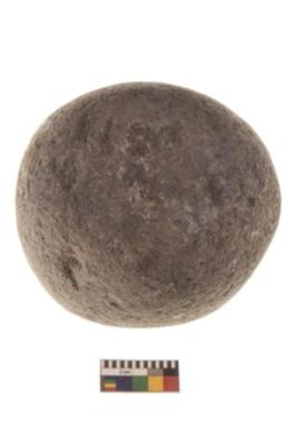 | Description / विवरण | Specimen of a hammer stone roughly rounded in shape with grounded edges and flattish base. |