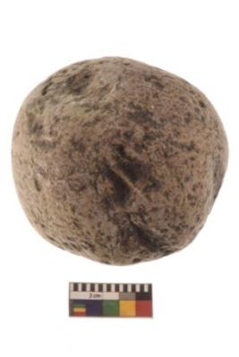 | Description / विवरण | Specimen of a hammer stone roughly rounded in shape with grounded edges. |