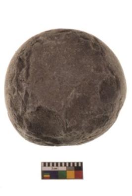 | Description / विवरण | Specimen of a hammer stone roughly rounded in shape with grounded edges and flattish base. |