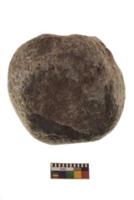 | Description / विवरण | Specimen of a hammer stone roughly rounded in shape with grounded edges and flattish base. |