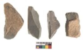 | Description / विवरण | There are n 4 utilized flake cores. There are multidirectional irregular dominant scar pattern on both dorsal and ventral face of the flake cores. Three are tapering at one end and one has sharp edges. |