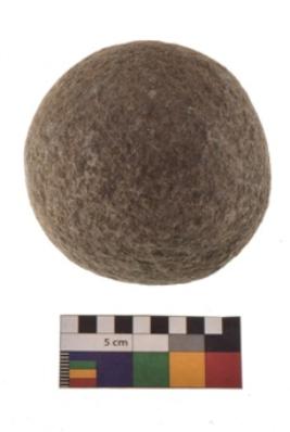 | Description / विवरण | Specimen of a spherical shaped hammer stone with battered surface |