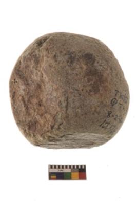 | Description / विवरण | Specimen of a hammer stone roughly rounded in shape with grounded edges and flattish base. |