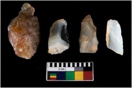 | Description / विवरण | There are n 4 ; worked utilized flakes; there are multidirectional irregular scar pattern on both dorsal and ventral face of the flakes. Two of them are tapering at one end. All are having sharp edges. |