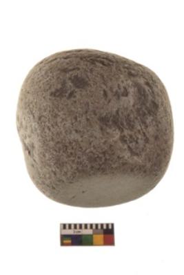 | Description / विवरण | Specimen of a hammer stone roughly rounded in shape with grounded edges and flattish base. |