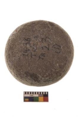 | Description / विवरण | Specimen of a hammer stone roughly rounded in shape with grounded edges and flattish base. |